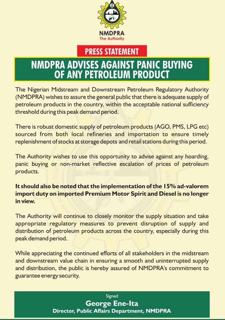 According to the Director, Public Affairs Department of the NMDPRA, George Ene-Ita, the proposed import duty is “no longer in view.” He also assured Nigerians of adequate product availability nationwide.Ene-Ita stated, “It should also be noted that the implementation of the 15 per cent ad-valorem import duty on imported Premium Motor Spirit and Diesel is no longer in view.”